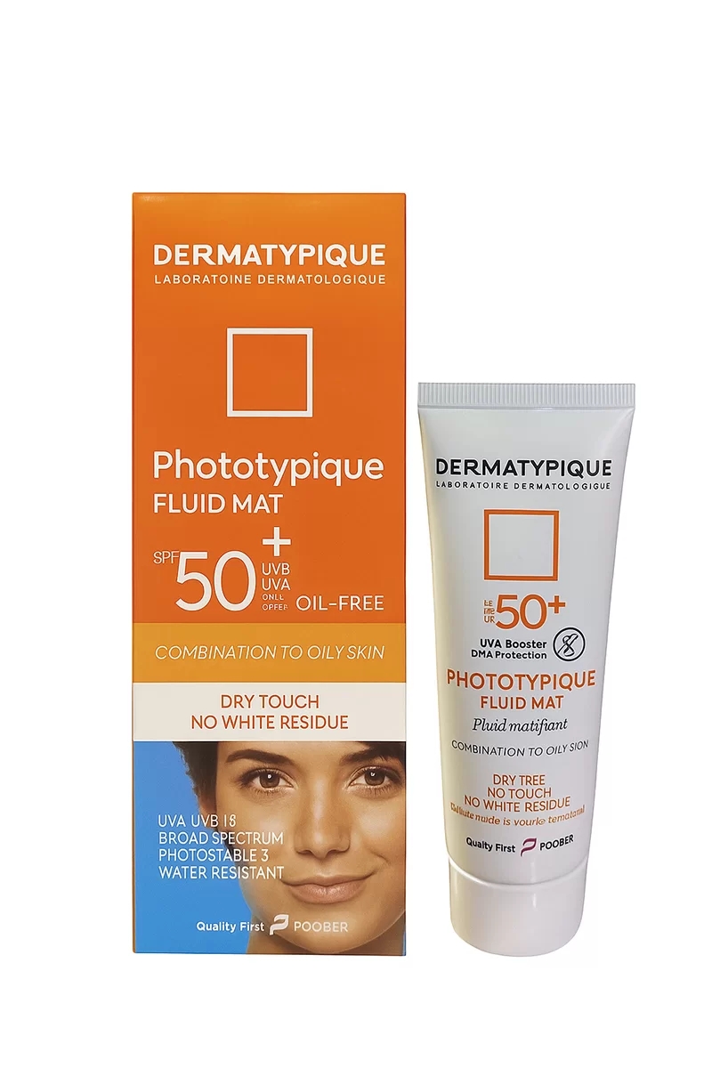 فلوئید ضد افتاب بی رنگ SPF50+ پوست چرب فنوتیپیک درماتیپیک